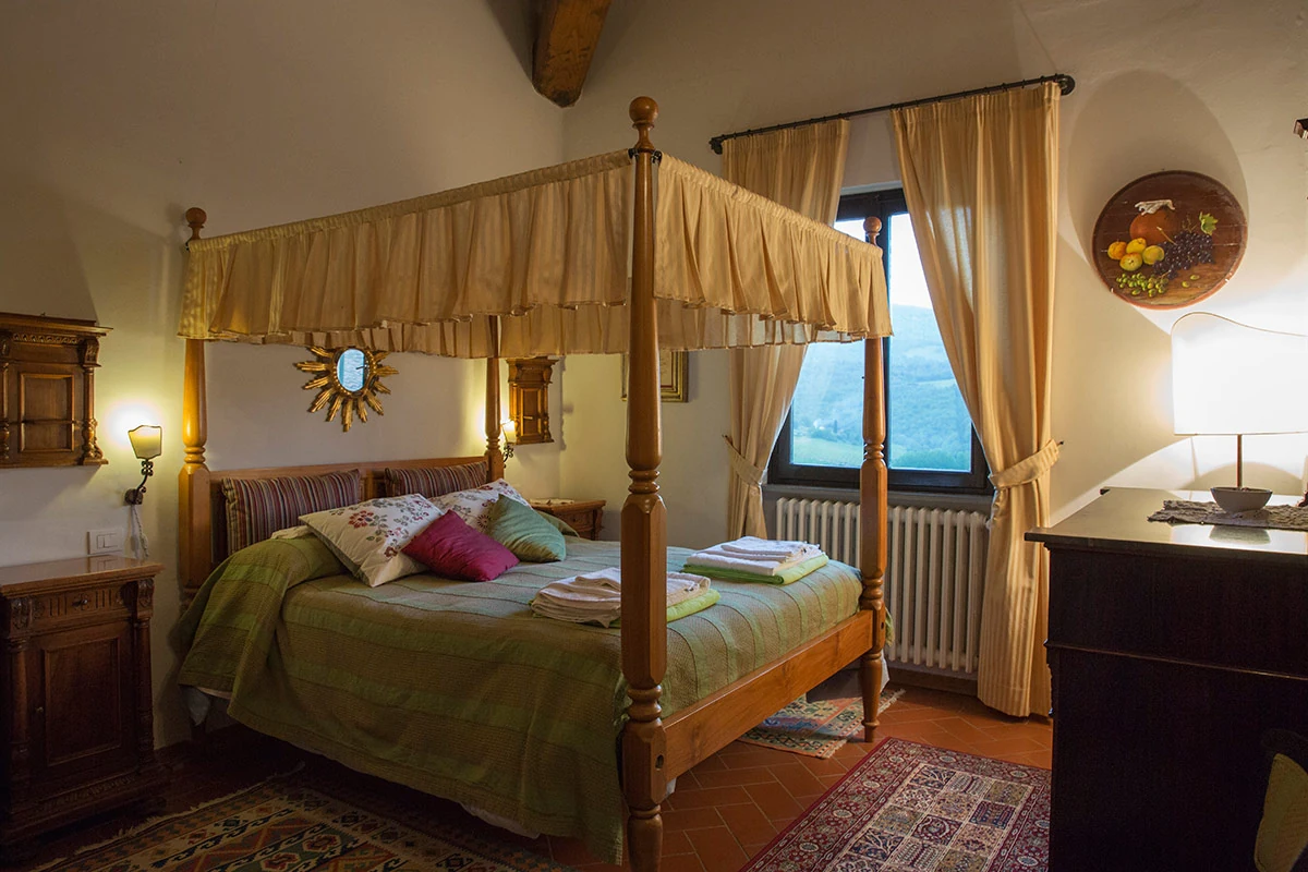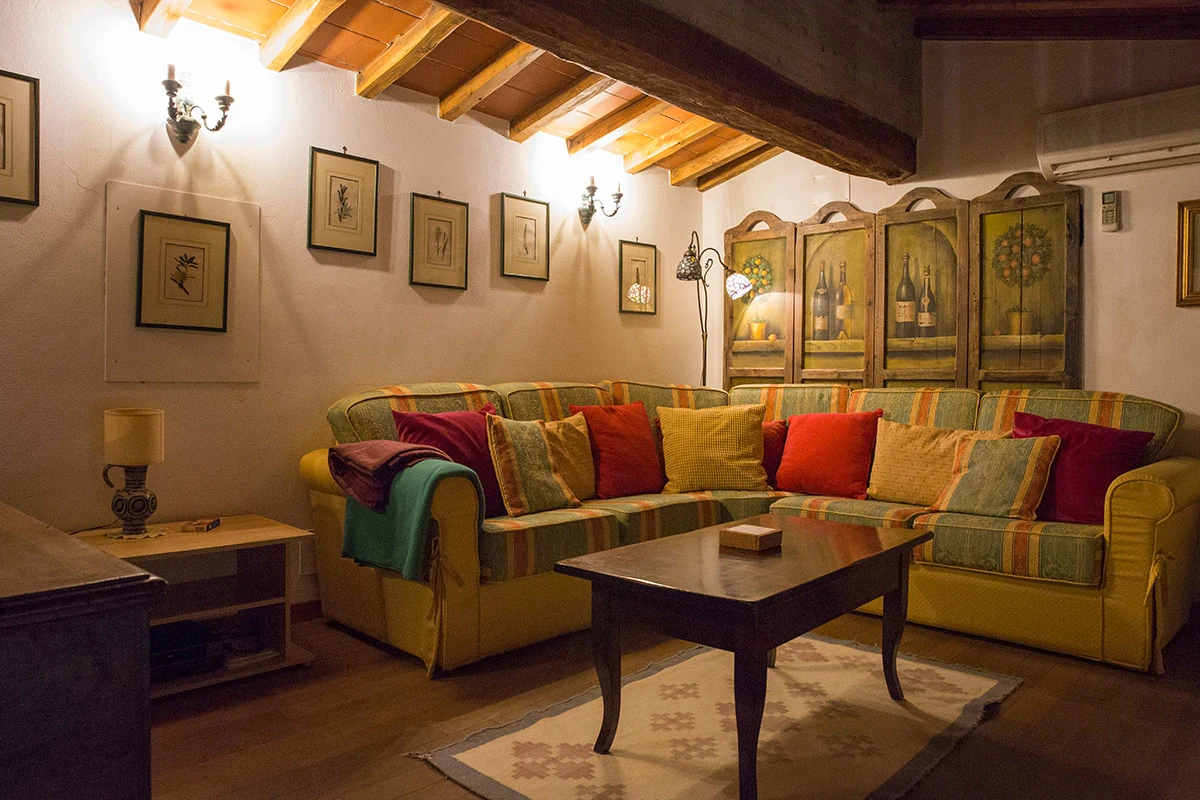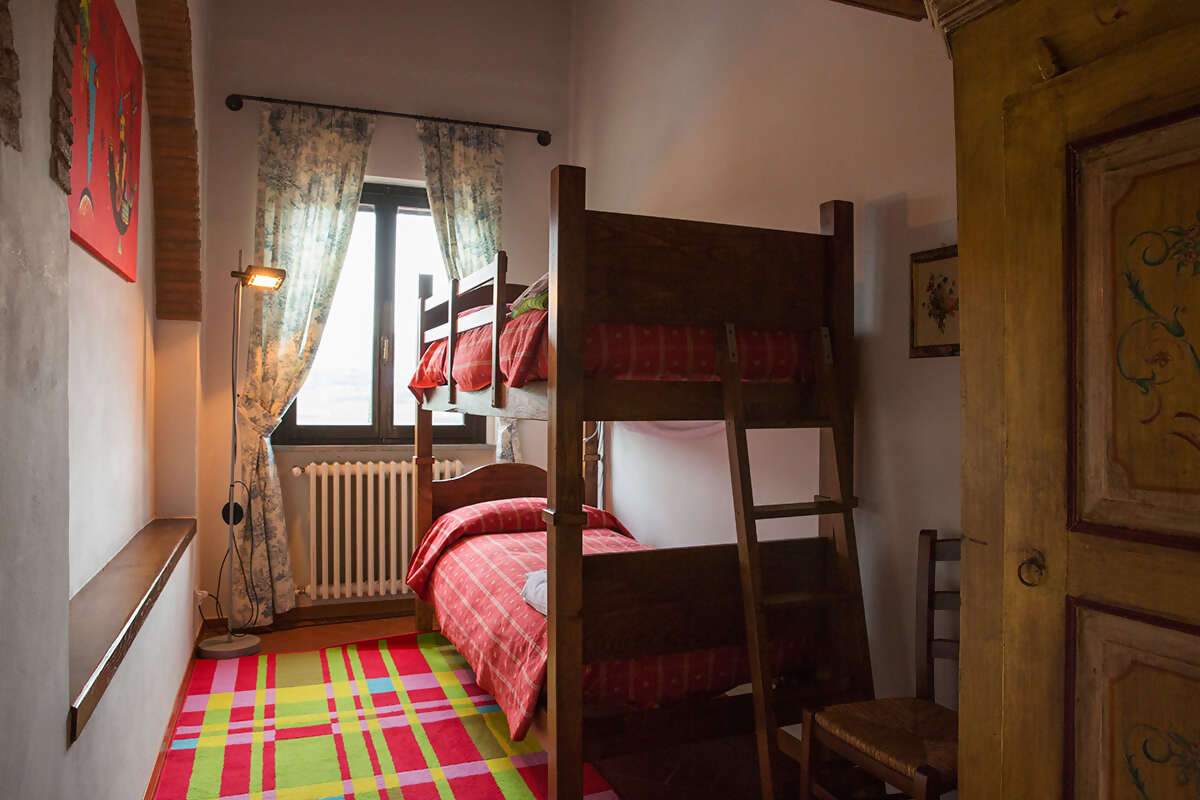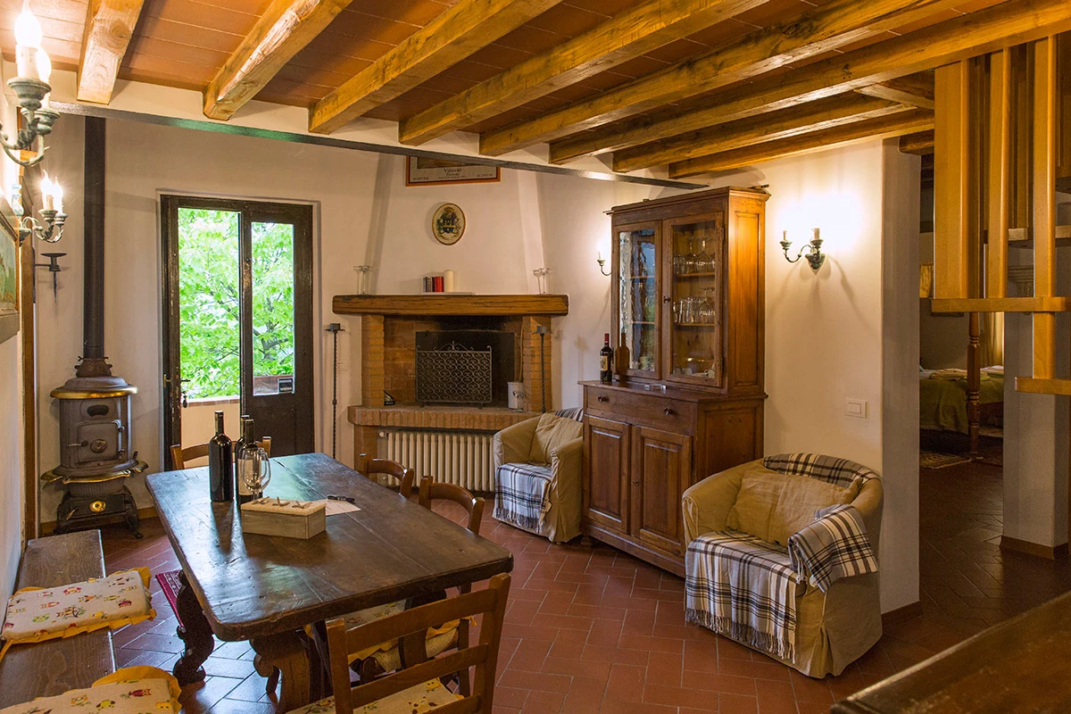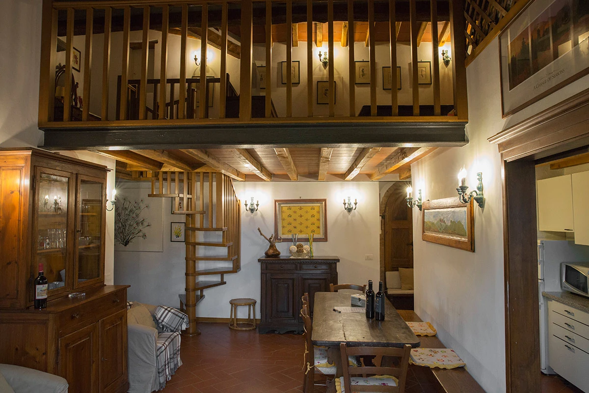 Il Viticcio offers a beautiful dining room with a Tuscan fireplace and comfortable sitting area for relaxing, plus a fully equipped kitchen in a separate area on the ground floor. Leading off from this area is a romantic double bedroom and a smaller room with twin beds, as well as a bathroom. A spiral staircase leads to a loft with an attractive living room, an alcove with a double bed, and a second bathroom. It has a small balcony, and the patio outside has a table, chairs, and an umbrella.